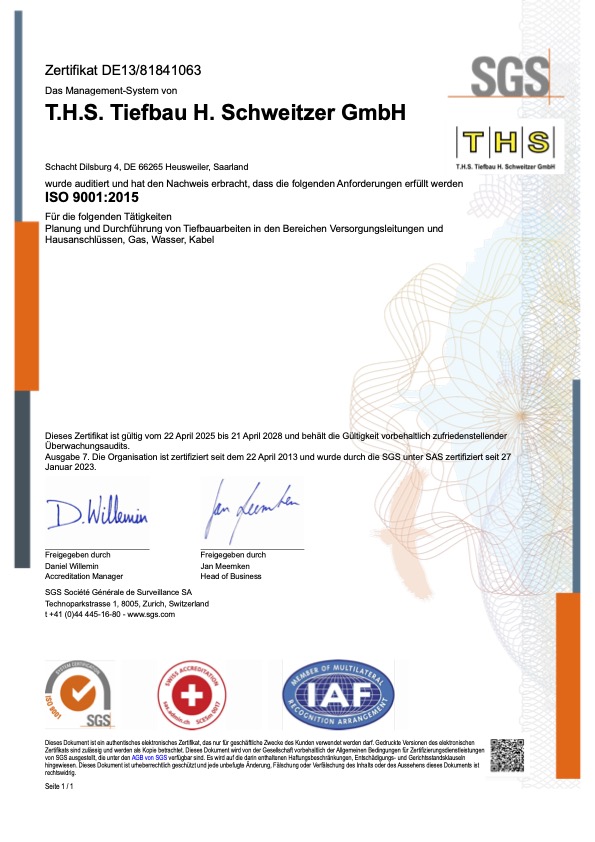 THS Tiefbau GmbH wurde im November 1989 von Herrn Herbert Schweitzer gegründet. Seither ist das Unternehmen in den Bereichen des Tiefbaus Gas, Wasser und Kabel für mehrere Versorgungsträger tätig. Nach einer Umfirmierung im Jahr 2010 wurde das Unternehmen von Herrn Holger Schweitzer geführt. Im April 2023 wurde die Geschäftsführung von Herrn Daniel Barth übernommen.